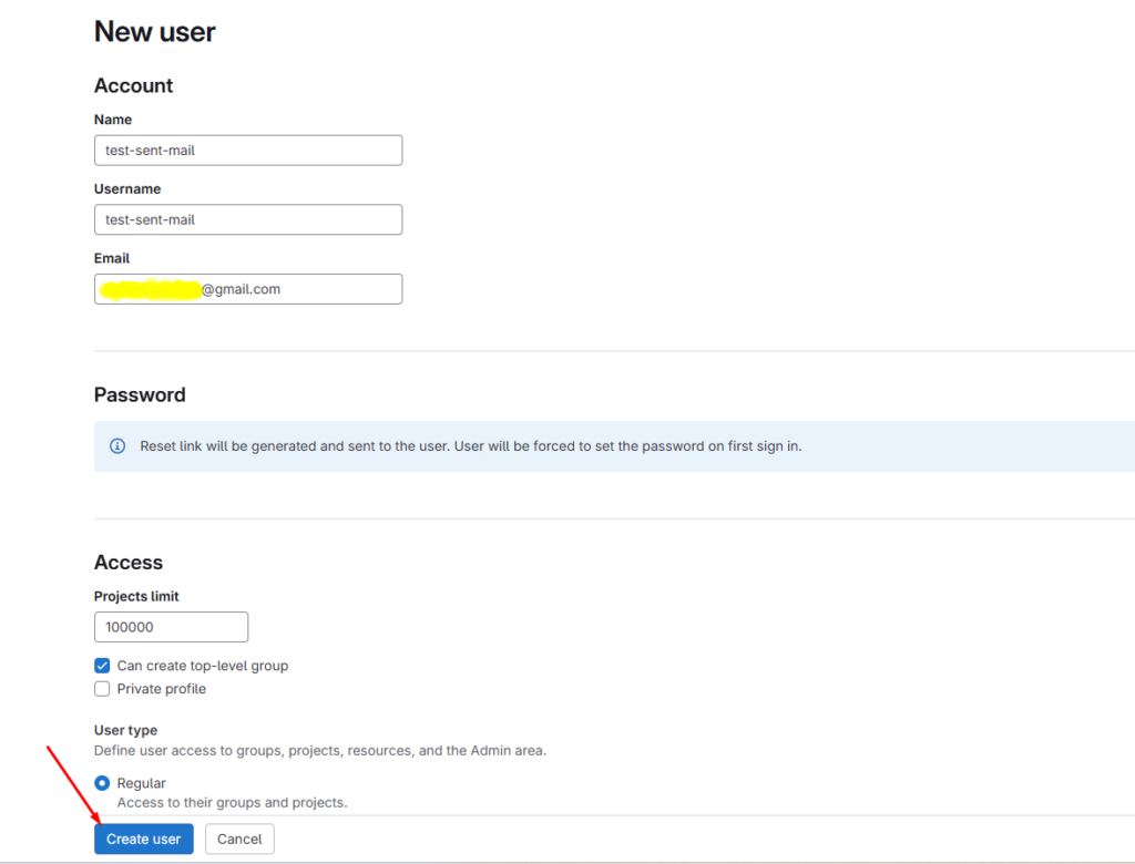 OK, là xong giờ test thôi. bạn tạo 1 user với tài khoản email có thật nhé. thì gitlab sẽ gửi 1 email về tài khoản bạn đăng ký để set mật khẩu và đăng nhập.